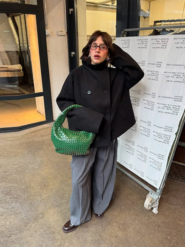 This short winter trench coat for women combines an urban casual look with a modern cut. It has a high collar and a double button fastening for a classic look. The jacket has dropped shoulders and a loose fit for comfort and a relaxed silhouette.