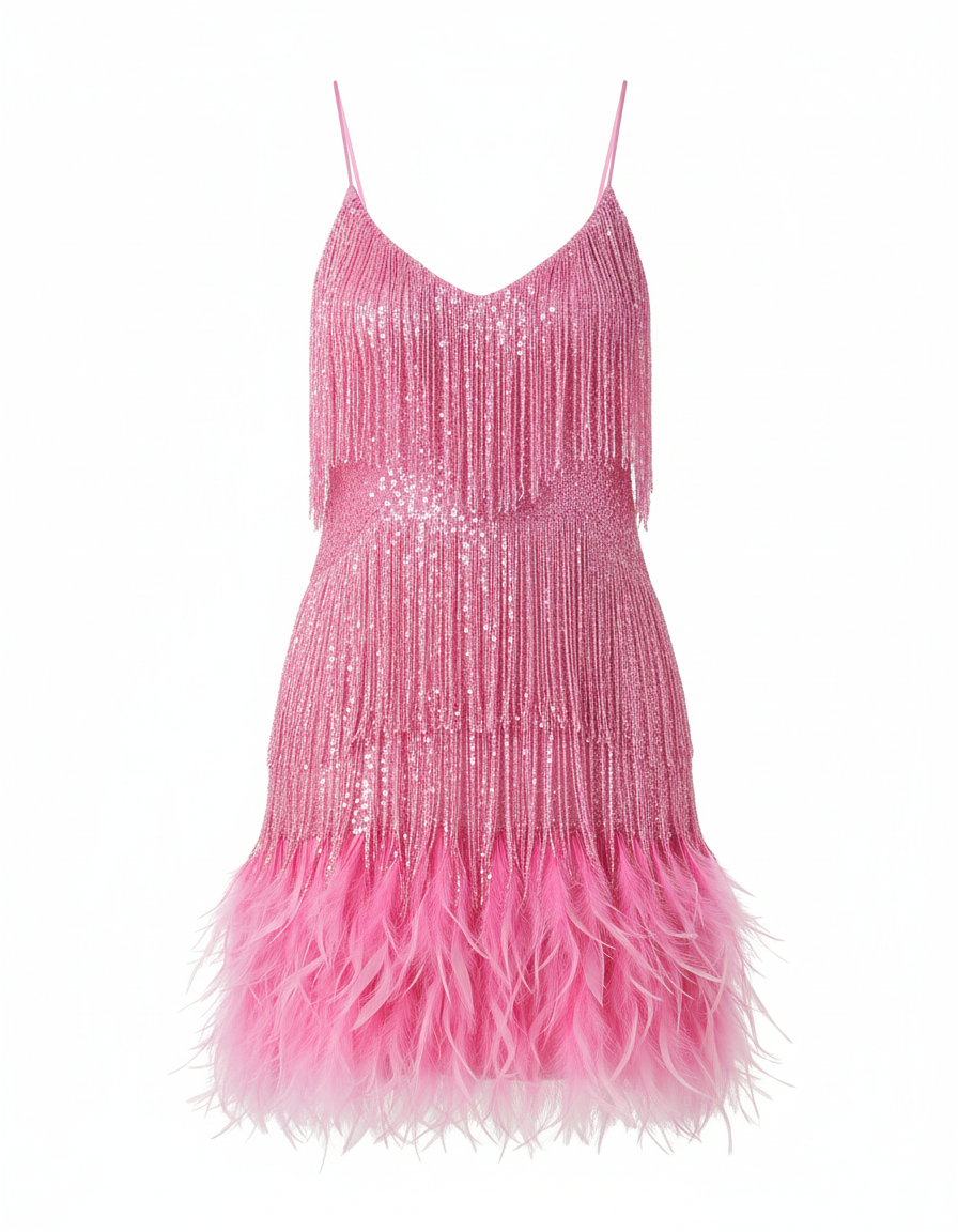 This Tassel Dress has a slim, fitted silhouette with spaghetti straps and sequin embellishments. It's crafted from lace fabric and features feather details at the hem. Available in nine colours, including White, Pink, Peacock Blue, Gold, Rose gold, Blue, Black, Red, and Wine Red, the dress blends classic elements with modern details for festive occasions. It's perfect for cocktail parties and costume events.